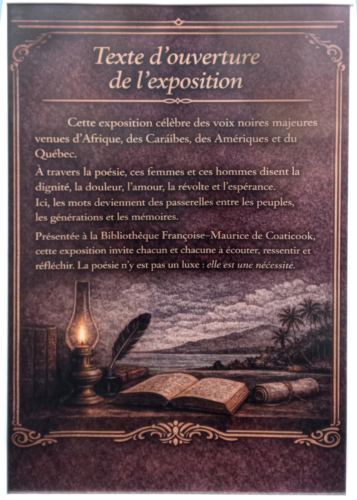 Cette exposition célèbre des voix noires majeures venues d’Afrique, des Caraïbes, des Amériques et du Québec. À travers la poésie, ces femmes et ces hommes disent la dignité, la douleur, l’amour, la révolte et l’espérance. Ici, les mots deviennent des passerelles entre les peuples, les générations et les mémoires.Présentée à la Bibliothèque Françoise-Maurice de Coaticook, […]