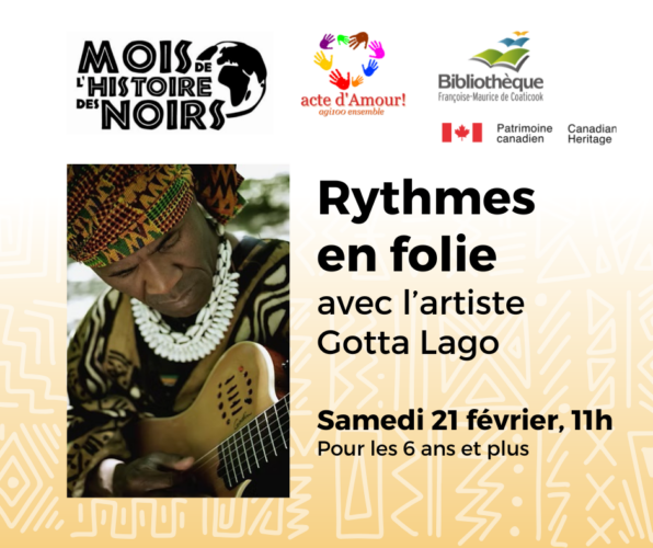 Pour célébrer le Mois de l’histoire des Noirs, la Bibliothèque Françoise-Maurice de Coaticook reçoit l’artiste Gotta Lago le samedi 21 février à 11h. À travers une légende fantastique, Rythmes en folie nous transporte dans l’immense univers des percussions à travers plusieurs pays de la planète. C’est un spectacle participatif et dynamique, mêlant conte et musique, […]