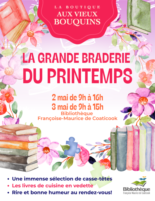 2 endroits pour magasiner : à la bibliothèque pour les casse-têtes et plus, et à la boutique Aux vieux bouquins, située au sous-sol de la bibliothèque, pour un plus vaste choix de romans et autres (HORAIRE SPÉCIAL pour les 2 jours).